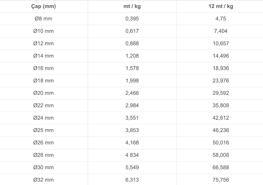 Nervürlü İnşaat Demiri Çap Listesi
